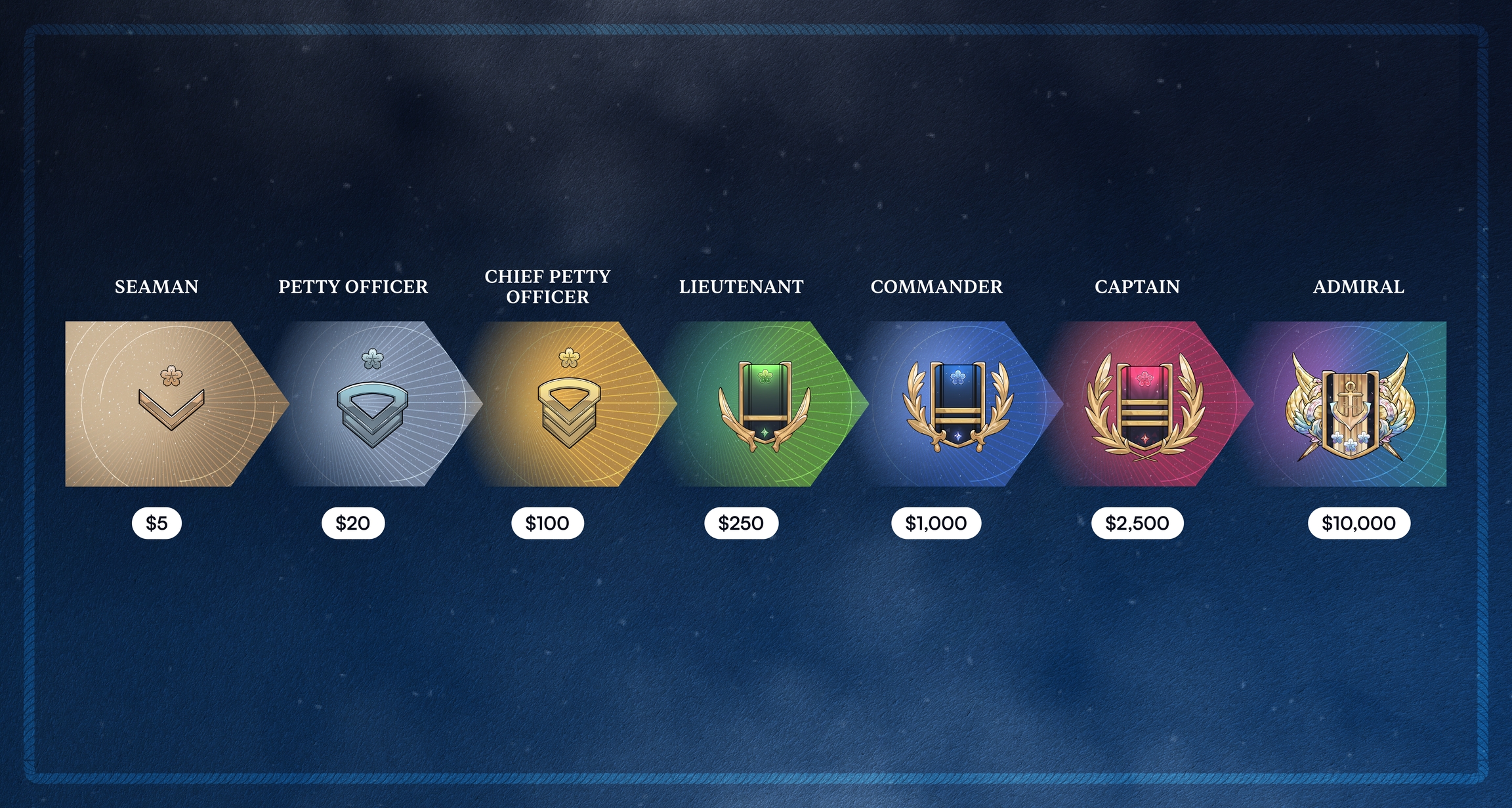 Seaman through Petty Officer ($5–$20): Digital content including character reveals, rank emblems, production updates, and your name on the Commendation Board.