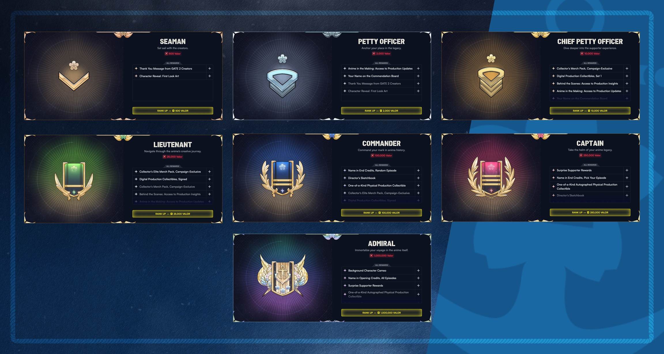The GATE 2 campaign uses a naval-themed rank system designed by Oshi, inspired by the military themes of the GATE franchise. These ranks are part of the fan participation experience on Oshi's platform, not part of the anime itself.