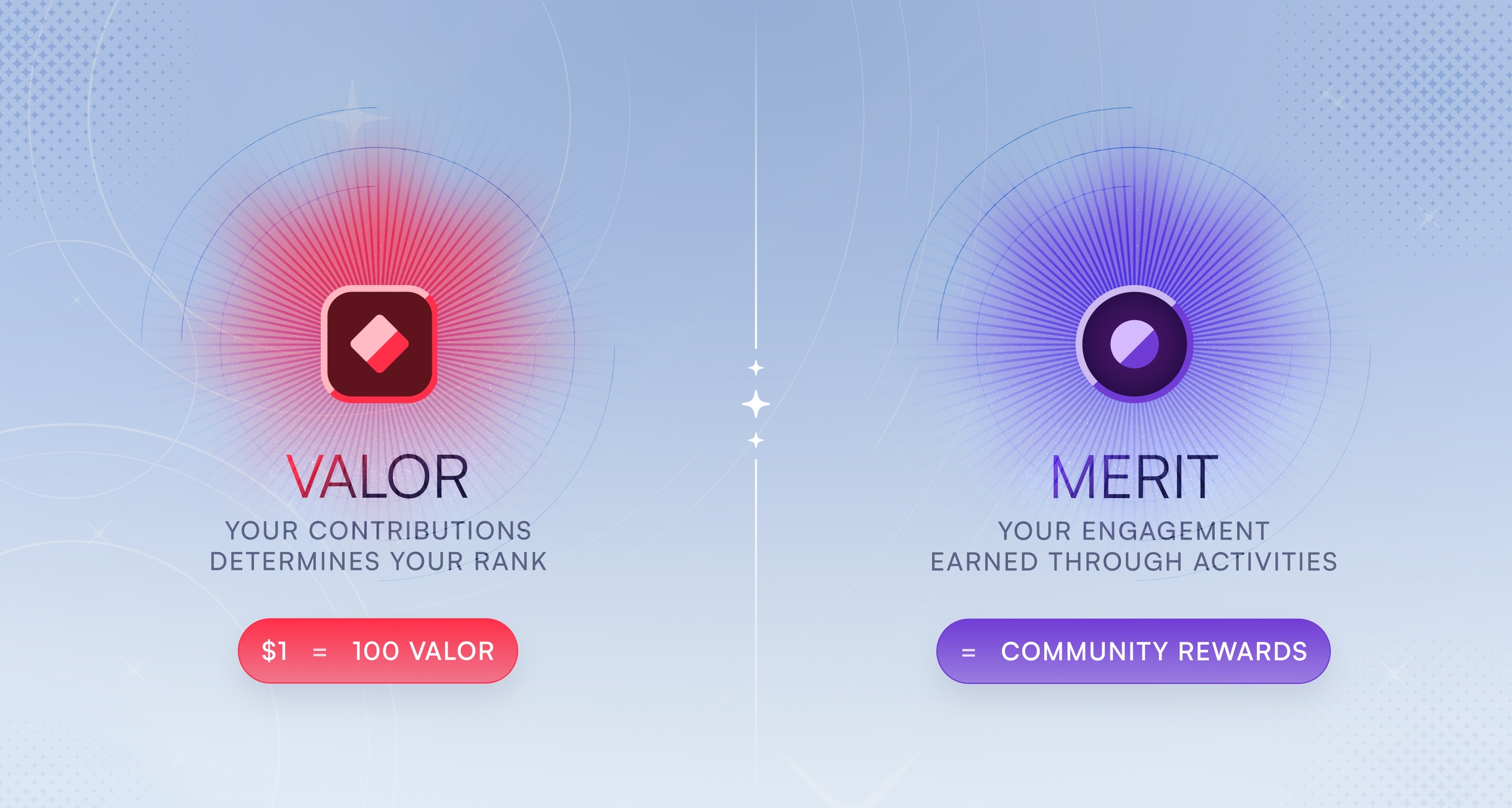 Two point systems: Valor tracks contributions, Merit rewards community engagement.