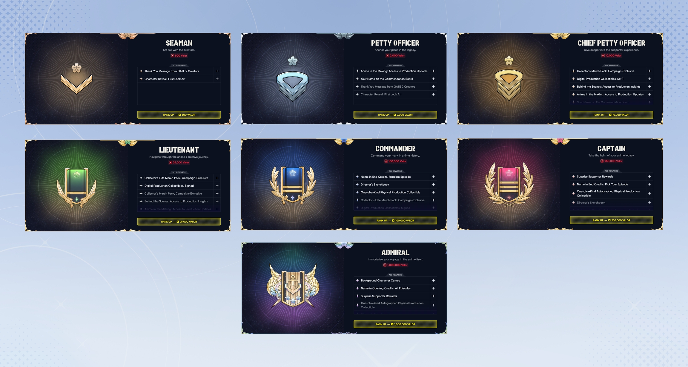 Petty Officer and above: Your name on the Commendation Board, plus production updates as the anime progresses.